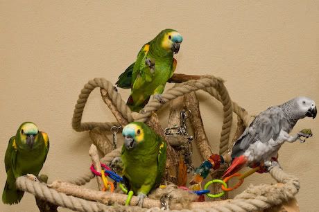 De 2 grote geelschouderblauwvoorhoofden zijn van Marieke (kennis) waar Jodie nu tijdelijk verblijft. De cobinatie Grijze en Amazone is geweldig. Zelf vind ik Amazones de leukste vogels die je kan hebben, maar ik zou ze nevernooit aanraden. Zeker niet een hot three vogel (Blauwvoorhoofd, Geelnek en Dubbelgeelkop).
