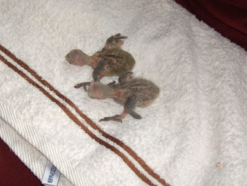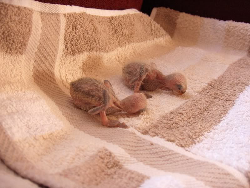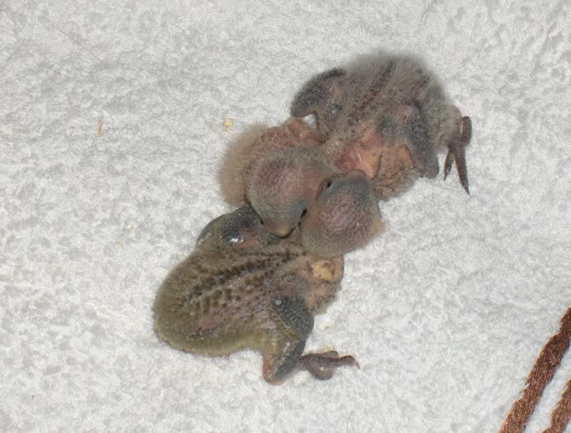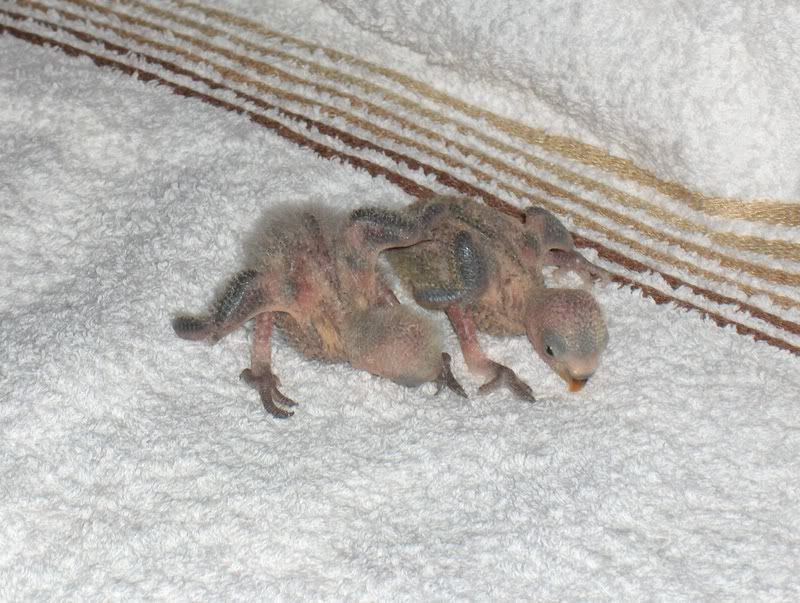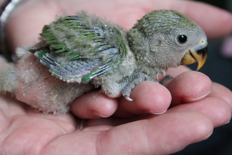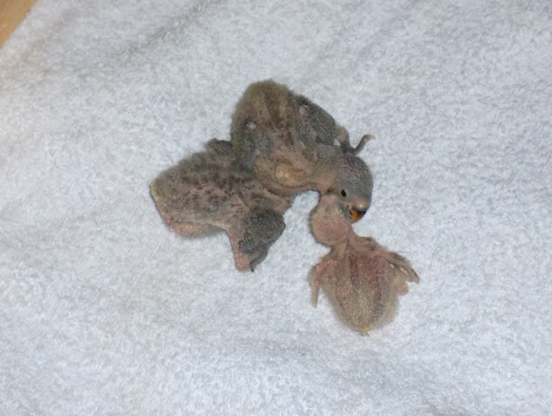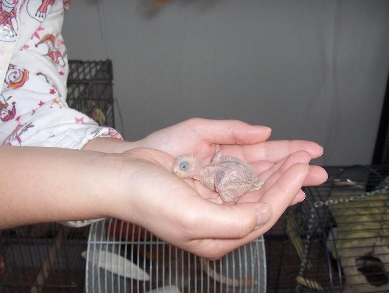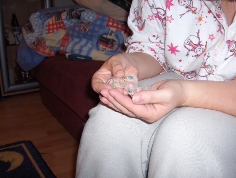 Hier zie je baby 2, Pluisje. Mijn vrouwtje pakte haar even, ik vind het niet erg, maar toch hou ik haar goed in de gaten, straks vergeet ze hem terug te stoppen in mijn nestje, nou dan ga ik toch even flink tekeer denk ik  tongue2