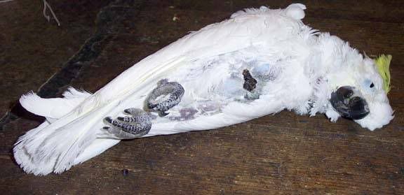 De onderstaande foto's zijn niet om mensen af te schrikken, maar wel het resultaat van een verkeerde omgang met een kaketoe. Gelukkig zijn onderstaande vogels goed opgevangen en kunnen ze hopelijk nog een lang en gelukkig leven hebben. Meer foto's zijn te vinden op www.mytoos.com en op de Foster Parrots pagina. Kijk hiervoor bij de links.