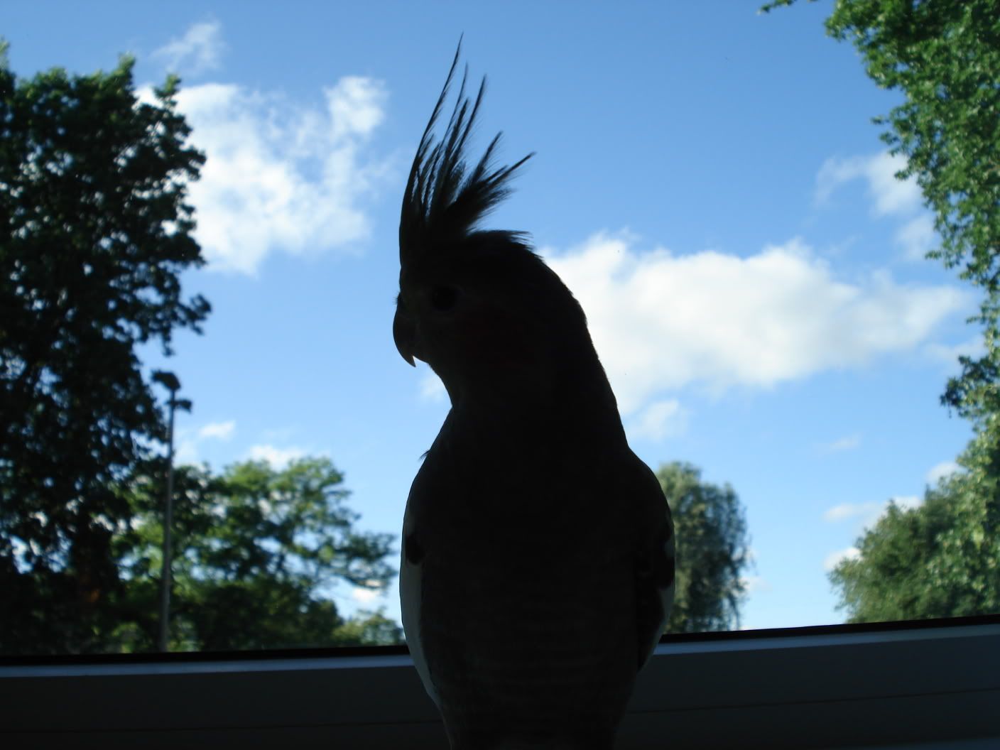 Vanmorgen met verschonen Lucky in de boom gezet, die naast cor haar kooi stond, hij klom omhoog, hupte op een dichts bijzijnde tak en ging cor eens inspecteren :)