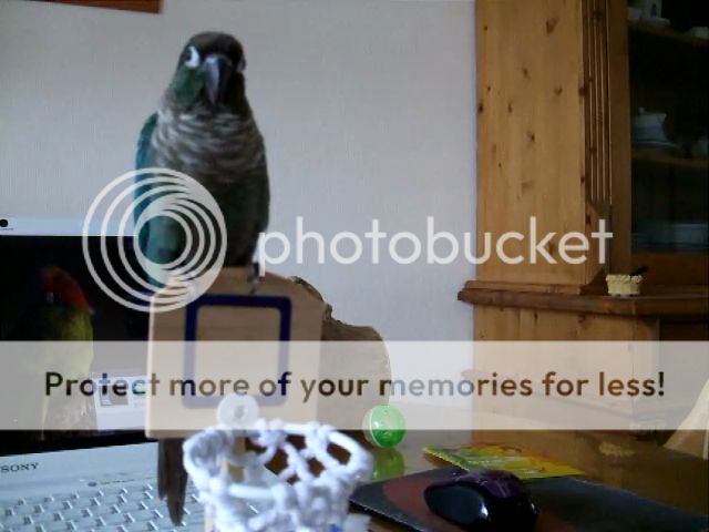 Kapitein Haak, onthaakt!! Hij vond het VRESELIJK......ik heb nog nooit 1 van mijn vogels zo horen schreeuwen :(